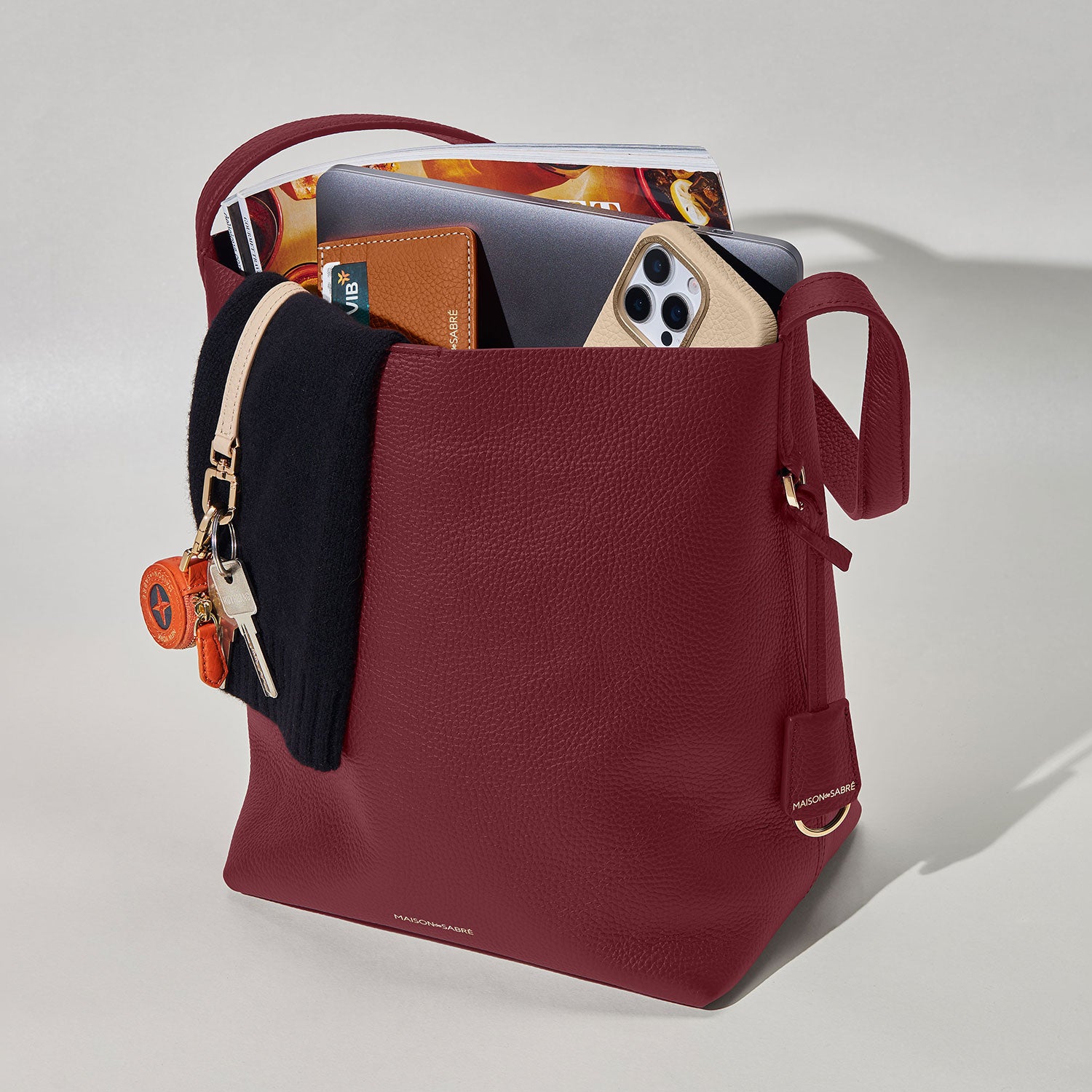 A lightweight, medium sized tote, inspired by the classic drawstring bucket bag. The slouchy design is crafted entirely from our softest-ever full-grain European leather and features a spacious, reinforced base panel for enhanced storage. Perfected for business-to-leisure, with space to stow laptop devices up to 14", the elevated companion is fitted with three slip pockets, one zipped pocket and a dedicated keyclip, while an elongated and padded shoulder strap ensures comfortable all-day carry. External statement hardware invites secure SABRÉMOJI™ Charm attachment to create expressive statements, while bold dual-tone colourways spark playful exuberance with every opening. The world’s most refined everyday carry-all has arrived.