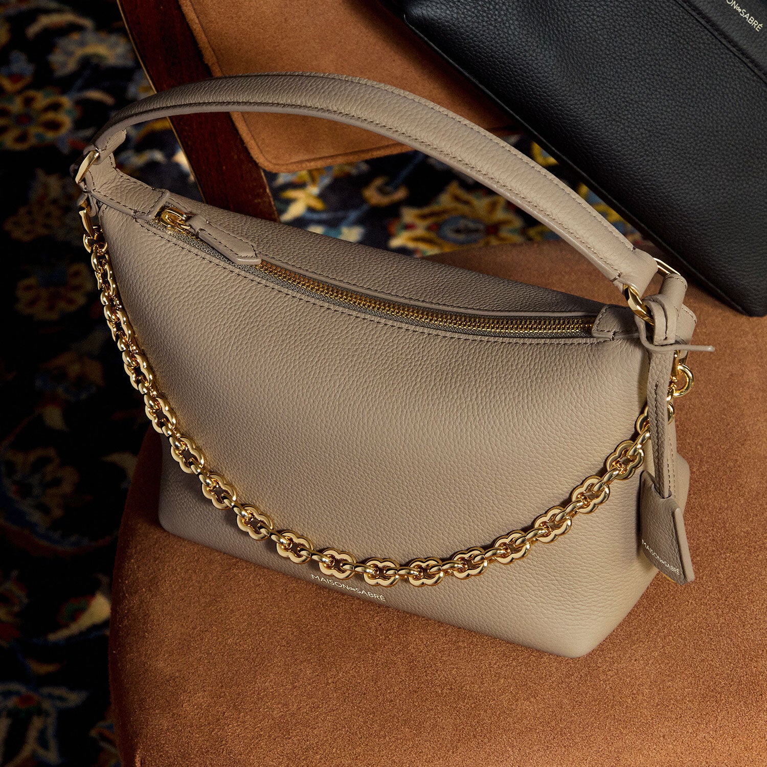 A limited-edition reimaging of the bestselling Small Soft Hobo arrives to illuminate the night. Softening our original icon’s sculptural curves with supple calf leather, the plush statement effortlessly refines your after-dark signature. A hand-polished MAISON de SABRÉ Eternity Chain, celebrating signature brand codes and the spirit of infinite possibility, shimmers with intertwined gold figure-eight links to catch and reflect the light. Two SABRÉMOJI™ Charm Link D-rings allow for secure Charm attachment, a detachable crossbody leather strap creates versatile styling, and natural suede lining ensures sumptuous stowage. The evening companion remains true to the hallmark characteristics of its inspiration: a semi-structured base, internal zipped and slip pockets, and a padded bombé handle are all meticulously crafted. Arriving in two all-new colourways, the masterpiece is perfected to steal every show.