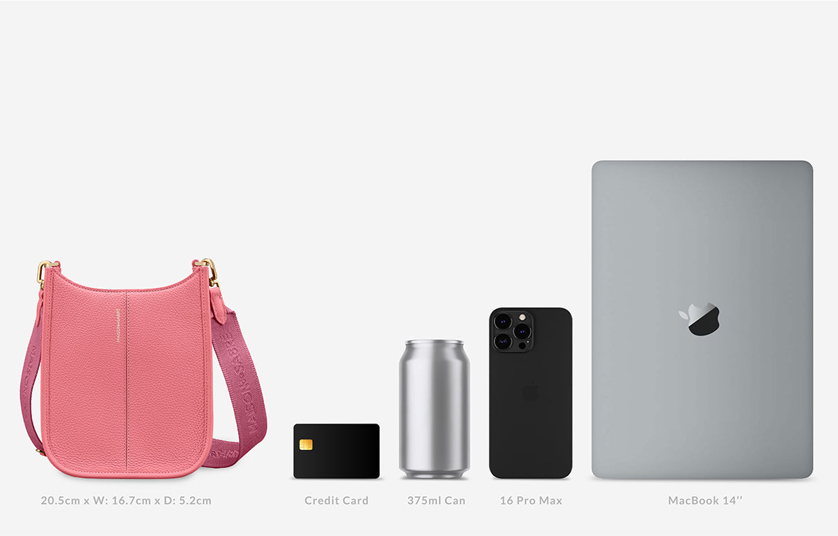 • Small silhouette designed to perfectly fit the iPhone, keys, wallet, AirPods and sunglasses