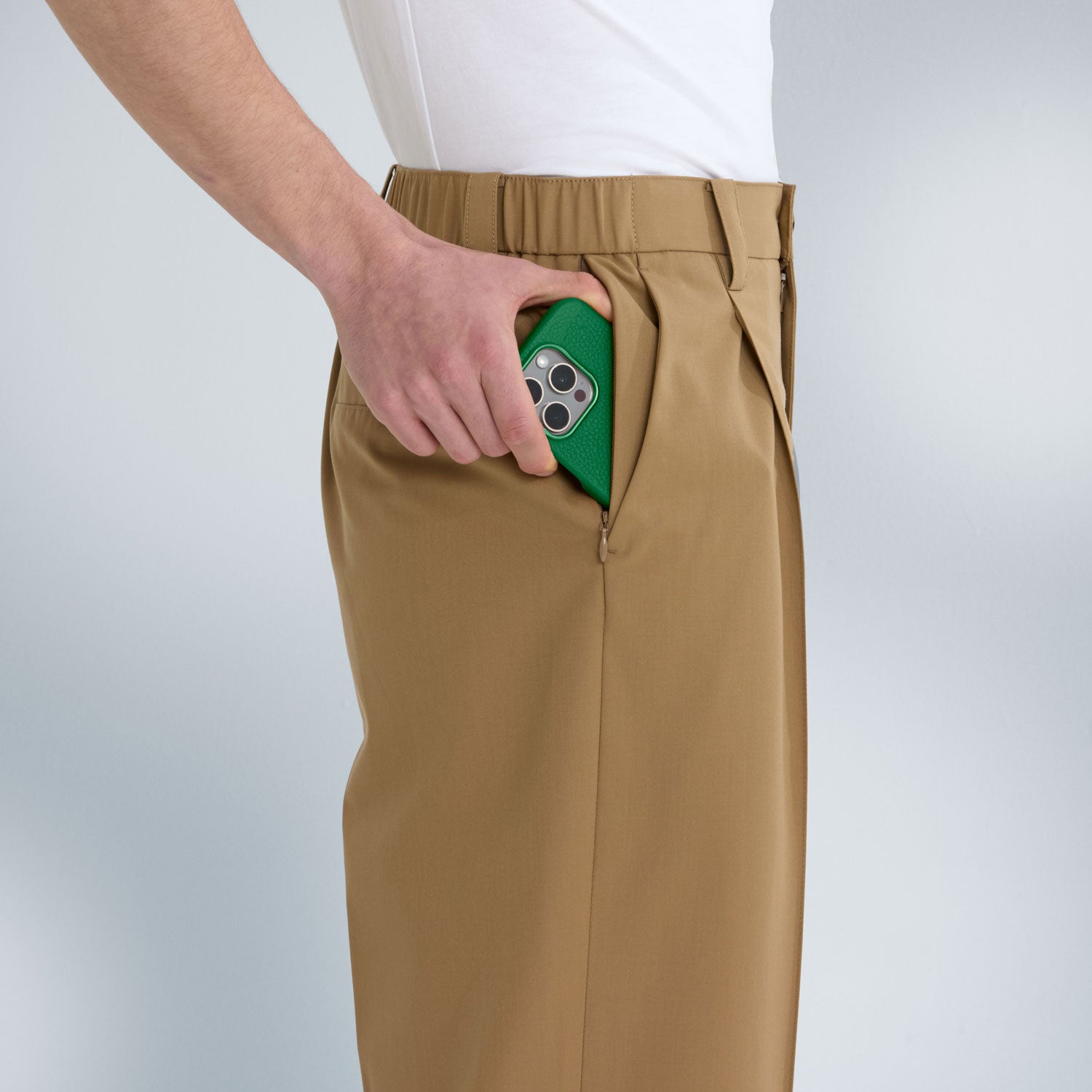Meet the world’s most luxurious crease, water and wind resistant pant, designed to be paired with The Travel Uniform Jacket. A unisex wear with draped proportions, the straight-cut wide-leg design is crafted from Woolmark-certified, 100% Australian Virgin Merino wool for enduring comfort. Featuring a dual in-seam pocket system with zippers, rear single welted pockets, an elasticated waistband, a single stitched pleat and a high rear-rise that universally flatters. The lightweight and breathable statement pant for effortless manoeuvrability on every journey.
